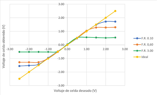 Las pruebas realizadas con el fin de evaluar la capacidad del sistema para establecer un voltaje de celda deseado revelaron una dependencia importante entre esta capacidad, el factor resistivo de la celda y su valor de resistencia total. Factores resistivos altos, así como resistencias totales de celda bajas, limitan el rango de voltajes de celda que pueden ser aplicados de manera estable por el circuito de control a la celda electroquímica.