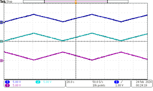 Fig. 6. Oscilograma que muestra: 1) el voltaje obtenido a partir de la señal PWM; 2) el voltaje del electrodo de referencia; y 3) el voltaje de salida del seguidor de corriente, para un barrido de voltajes de celda entre -2 V y +2 V con factor resistivo de 0.10, resistencia total de celda de 5 kΩ, y RJ de 4.7 kΩ.