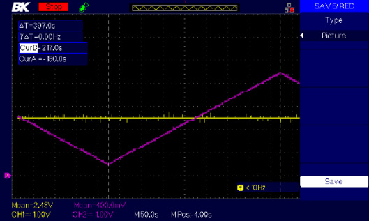 Fig. 7. Oscilograma que muestra el voltaje de los electrodos de referencia (morado) y trabajo (amarillo) durante un barrido de -2 V a +2 V en el voltaje de celda. Los cursores (línea punteada) se utilizan para medir la velocidad de barrido experimental.