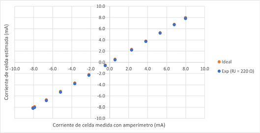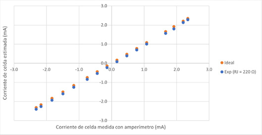De acuerdo con(16), para una resistencia de retroalimentación RJ de 220 Ω, el rango de corrientes de celda que se puede medir con el sistema va desde -11.36 mA a +11.36 mA. Ahora, la corriente de celda se define de acuerdo con el valor de la resistencia de celda total que se tenga. Para una resistencia de celda de 220 Ω, las corrientes de celda esperadas se ajustan bien al rango de corrientes antes mencionado, por lo que el error promedio que se obtuvo en estas mediciones fue de 4.62 %. Por lo tanto, la diferencia entre las corrientes medidas con el amperímetro y las corrientes estimadas es bastante pequeña, como se observa en la Fig. 8.