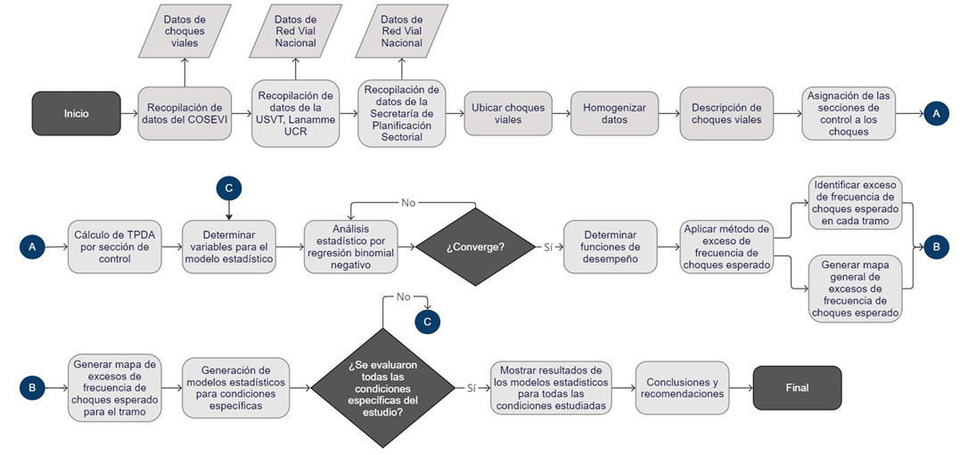 El estudio se realiza aplicando el método de exceso de frecuencia de choques esperado, ajustado con Bayes empírico. La metodología se toma del Manual de Seguridad de Carreteras de la AASHTO. El análisis se aplica a todas las secciones de control con disponibilidad de datos requeridos para la investigación, por lo que se estudian 911 secciones de control de la Red Vial Nacional.