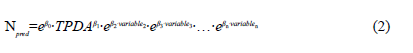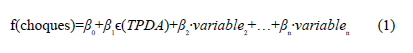 Ahora, en (1), se muestra la forma de la tasa de choques de la distribución, donde β0 corresponde al término constante, β1 corresponde al término asociado al TPDA y el término constante β2, β 3, β 4, …, βn corresponde a los coeficientes asociados a las variables 1, 2, 3, …, n. Los coeficientes se obtienen del modelo generado y las variables son aquellas que resulten ser significativas para el modelo analizado (16).