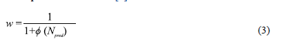 Consecutivamente, se realiza un ajuste por peso para verificar la confiabilidad de la función de desempeño de seguridad vial. El peso se calcula por medio de (3), donde w es el peso de Bayes empírico y ϕ es el parámetro de sobredispersión de la función de desempeño de seguridad. En este caso, un valor de sobredispersión bajo se traduce en una mayor confiabilidad y un ajuste por peso grande, con lo que se tiene una función de desempeño más confiable (4).