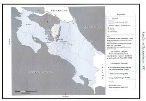 Los historiadores Maynor Badilla y William Solórzano (2010; 2014), muestran cómo un territorio ambiguo, con cientos de kilómetros de la provincia de Alajuela, se transformó con el paso de las décadas en una región como la de Occidente. En este sentido, algunas características comunes la amalgamaron a partir de los procesos de colonización, de poblamiento y por el desarrollo de una producción agrícola de subsistencia como comercial dentro de la dinámica del llamado capitalismo agrario (Samper, 2003; Gudmundson, 2010).