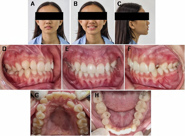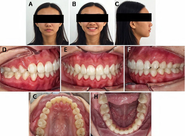 A 15-year-old female patient came to the clinic with the primary concern that her smile was not satisfactory. Upon completing the medical questionnaire, it was confirmed that the patient had no systemic disorders, traumatic history, or previous orthodontic treatments. Following extra- oral evaluation (Figure 1), she was found to have a symmetrical, aesthetically pleasing, oval-shaped face. When she smiled, about two-thirds of the crowns of her maxillary anterior teeth were visible. Her facial profile showed a straight alignment with a prominent chin and a deep labiomental groove. Upon intra-oral examination, she was found to have a full set of permanent teeth with molar class I and canine class I relationships on the right side, and a molar class I on the left side. The facial midline aligned with the mandibular dental midline, while the upper dental midline was shifted 2mm to the left.
