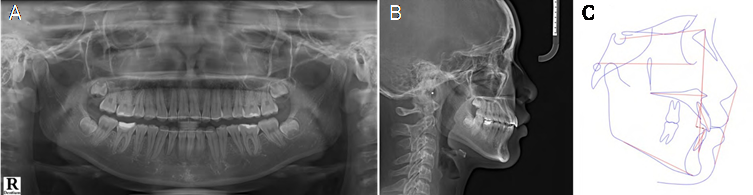 Figure 5 Panoramic radiograph (A), lateral cephalometric radiograph (B), and tracing (C) after orthodontic treatment.