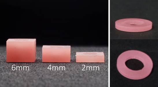 To prepare samples, quadrangular and circled molds were designed (3D MatterControlTM Design Program Version 2.20.1.10422) and 3D printed (DLP 3D printer MAX UV, Asiga, NSW Australia) employing a dental-specific 3D printing resin-based material (Freeprint® denture, Detax Ettlingen). Quadrangular molds were used to create RBCs’ specimens (n=10) for the microhardness (MH) and degree of conversion (DC) tests. Three different dimensions were employed to simulate varying restoration depths: A) 2mm (4x4mm by 2mm in height), B) 4mm (4x4mm by 4mm in height) and C) 6mm (4x4mm by 6mm in height). Circular molds measuring 2mm (thick) by 8.5mm (diameter), were used for the biaxial flexural strength (BFS) test as seen in Figure 1. Additionally, 1mm thick discs and squares were built to work as spacers between the main mold and the LCU.