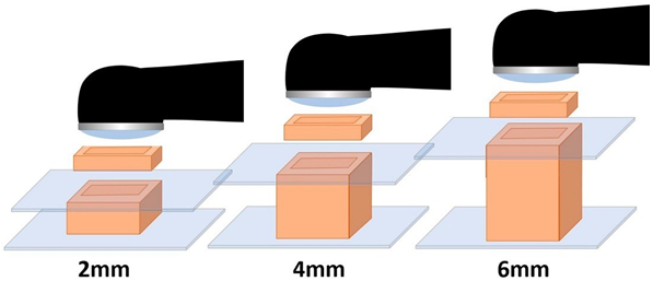 Figure 2 Micro hardness / Degree of conversion samples’ preparation scheme, according to each depth group: 4x4x2 mm, 4x4x4 mm and 4x4x6 mm cubes, celluloid band on the external surface and the spacer (1mm thick) to place the lamp.