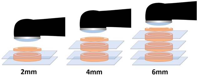 Figure 3 Biaxial flexural strenght samples’ preparation scheme, according to each depth group: 8.5mm diameter by 2mm thick discs, stacking them one on top of the other until reaching the desired depth (4 or 6mm), each separated by a celluloid band and placing the 1mm thick spacer on top to place the lamp.