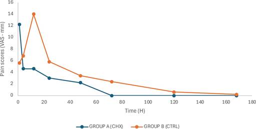 However, the VAS Results indicated that, clinically, Group A experienced a lower degree of postoperative pain and avoided the pain peak observed in Group B after 12 hours (Figure 2). All mean VAS scores were consistently lower for the CHX group, which also demonstrated a higher proportion of pain-free values compared to the placebo group.