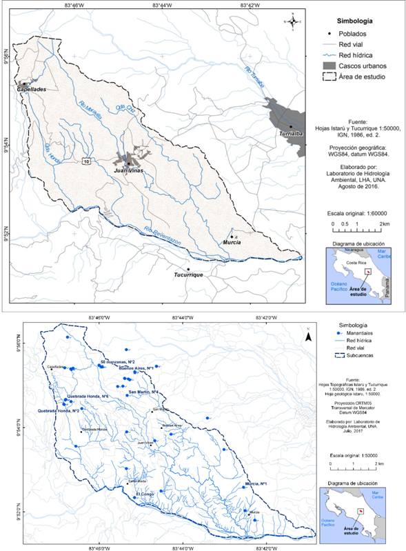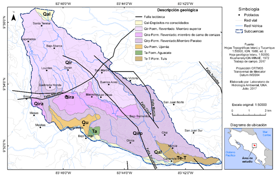 El área de estudio tiene una extensión de 46,8 km2 y está localizada al noreste de la provincia de Cartago, entre las coordenadas geográficas 83°47'30" - 83°40'00" latitud norte y 9°52'30" - 9°50'00" longitud oeste, y entre las coordenadas 522 000m - 534 000m este y 1 090 000m - 1 098 000m norte del sistema de Proyección Transversal de Mercator para Costa Rica del 2015 (CRTM05) (Figura 1). Ubicada sobre la margen izquierda del río Reventazón-Parismina, vertiente del Caribe de Costa Rica, el área está conformada por las subcuencas de los ríos Maravilla, Chiz y Quebrada Honda. La época lluviosa se presenta desde mayo a noviembre y la época seca desde diciembre a abril, con una precipitación anual de 2500mm en la parte media y baja y de 3000mm en la parte alta (IMN, 2005). La máxima altitud es de 2000 m.s.n.m. y la mínima es de 650 m aproximadamente. La gradiente general de la cuenca es del 12 % alcanzando hasta el 30 % en el sector sureste en los alrededores de Murcia, en la parte baja de las subcuencas.