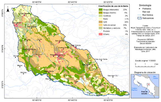 El mapa de fuentes difusas con potencial de generación de carga contaminante se generó a partir de la técnica de fotointepretación, según metodología descrita por Fernández (2000), con base en imágenes ortorectificadas World View II del año 2016, a una resolución espacial de 0.6 m, recuperadas de la plataforma Google Earth Plus. Sobre la imagen se realizó una digitalización de usos de la tierra a escala 1:5,000 en el software ArcGis10.5®. Se corroboró en el campo y actualización de usos, georreferenciando actividades a lo largo de la cuenca, con el navegador GPSmap 60CSx con +/- 3m de error. La reclasificación final fue de cinco clases: bosque, pastos, cultivos permanentes (caña de azúcar, café y árboles frutales), cultivos estacionales (hortalizas, maíz, frijol, legumbres, etc) y urbano, según la metodología descrita por Foster et al. (2002).