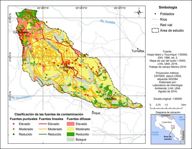 Adicional al uso de la tierra, se tomó en cuenta la calidad del agua de los ríos con base en un estudio realizado en el 2018 por Alfaro et al. (en preparación), en las partes alta, media y baja de los ríos Quebrada Honda, Maravilla y Chiz. En ese estudio, se analizaron coliformes y se aplicó la metodología del índice BMWP-CR (Biological Monitoring Working Party adaptado para Costa Rica). Este índice se basa en la presencia de familias de macroinvertebrados bentónicos mencionadas en el apéndice III del Reglamento para la Evaluación y Clasificación de la Calidad de Cuerpos de Agua Superficiales N33903-MINAE-S (La Gaceta, 2007). Finalmente, se utilizó el software ArcGis10.5®, con el fin de generar tres capas vectoriales, una para cada grupo de fuente contaminante: puntual, difusa y lineal.