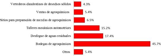 En menor cantidad, se encontraron cuatro vertederos de basura y chatarra clandestinos, cinco ventas de agroquímicos, donde se podrían presentar derrames accidentales de estos productos y, además, se localizaron seis sitios en donde los grupos agricultores disponen los estañones utilizados para preparar las soluciones de plaguicidas, a partir de los concentrados en polvo que se venden en los comercios de la zona (Figura 6).