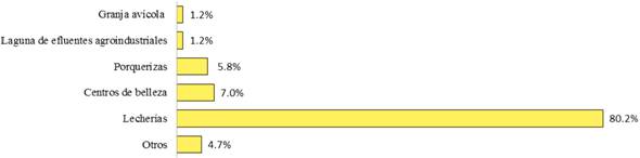 De las 86 fuentes puntuales con potencial moderado, la mayoría correspondió a lecherías, mientras que las porquerizas y granjas avícolas fueron menos frecuentes (Figura 7); la mayoría se localizó en la parte noroeste del área de estudio (Figura 4). Además, en la zona de estudio se localizaron seis centros de belleza, en los cuales se generan aguas residuales con lavados de tintes y otros tratamientos químicos que, generalmente, se depositan sin tratamiento en los sistemas sépticos o en el drenaje pluvial urbano, lo cual representa una amenaza por lixiviación de estas sustancias tóxicas al subsuelo.