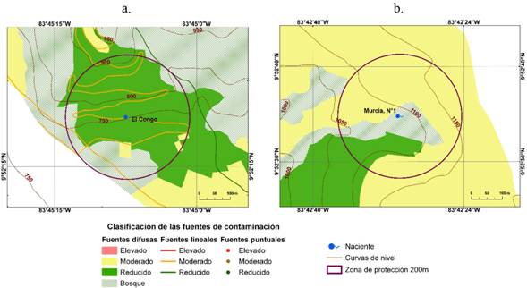 En los seis manantiales estudiados (Figura 1), las áreas de protección estuvieron invadidas por fuentes lineales y difusas (Tabla 1). En 50 Manzanas, Buenos Aires, San Martín y Murcia (Figura 8 a-b-d y 9b), las áreas de protección incluyeron fuentes lineales con potencial moderado y elevado y más de un 50 % de estas áreas han sido invadidas por fuentes difusas con potencial moderado. En los manantiales N.° 2 y N.° 6, pertenecientes al grupo de manantiales conocidos como Quebrada Honda, el área de protección final incluyó las áreas de protección combinadas de ambos manantiales, debido a que, por su cercanía, dichas áreas se traslapan en la mayor parte de su extensión (Figura 8c). En estos dos manantiales, aproximadamente un 25 % del área por radio fijo está bajo una fuente difusa con potencial elevado a la contaminación (Figura 8c).