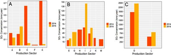 Graph 2 SO2 concentration in tons/year for the different production sectors sampled in Costa Rica, for the years 2014 and 2015. (Graph A: Production sectors between 0.0 and 0.7 SO2 tons/year; Graph B: Production sectors between 15 and 150 SO2 tons/year; Graph C: Production sectors between 250 and over 2500 SO2 tons/year).