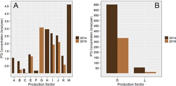 Graph 3 TSP concentration in tons/year for the different production sectors sampled in Costa Rica in 2014 and 2015. (Graph A: Production sectors between 0.0 and 4.5 TSP tons/year, graph B: Production sectors between 50 and 650 TSP tons/year). Note: Our own research source.