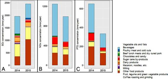 Vegetable oils and fats, sugarcane by-products, fruit products, legumes and vegetables, as well as coffee roasting and grinding top the list of industries with the highest emission for 2014, with 652.09, 140.40, 123.39 and 249.08 tons/year, respectively, and presented values of 510.61, 91.88, 112.25 and 213.86 tons/year for 2015, respectively.