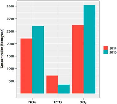 As for the year 2015, the highest SO2 and NOX emission values reported were 3537.29 and 2695.62 tons/year, respectively, while the year 2014 reported the highest total suspended particles (355.82 tons/year).