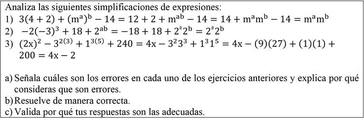 La acción de validar (consiga c) implica comunicar el uso incorrecto de la extrapolación lineal de la base respecto a sus exponentes, la aplicación de las leyes de los exponentes y de los signos, jerarquía de operaciones y, la propiedad distributiva (Tabla 3), es decir, comunicar la interpretación de manera estructurada. En este sentido, la explicación explícita de los errores identificados valida los procedimientos adecuados