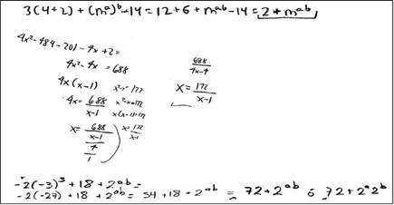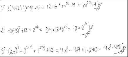 1. 3(4 + 2) + (m a)b -14 =12 + 6 + m ab - 14 =18 + m ab - 14 =4 + m ab 2. -2(-3)3 + 18 + 2ab=54 + 18 + 2ab =72 + 2ab 3. (2x)2 - 32(3) + 13(5) + 240 =4x 2 -36 +115 +240 =4x 2 - 729 + 1 + 240 =4x 2 - 488