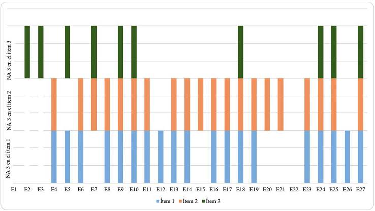 En el caso de la resolución del ítem 1 desarrollada por el E7, se tiene un error al no considerar el número 6 dentro de sus operaciones, es decir, suma 12-14 únicamente. Por otra parte, la resolución del E22 al ítem 3 indica que trata de encontrar la solución a la expresión como si fuera una ecuación, realiza operaciones agrupando términos semejantes hasta que identifica y resuelve una ecuación cuadrática. Sin embargo, si se considera únicamente la ecuación cuadrática, el procedimiento para determinar los valores de la letra x tampoco es correcto; es decir, no desarrolla procedimientos de manera precisa y flexible. Finalmente, el E26 no distingue que la expresión 2ab ≠ 2a2b para el ítem 2. La Figura 4 muestra los estudiantes que resolvieron cada uno de los ítems con el nivel de algebrización esperado (NA3).