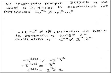 Al interpretar, se identificó que los estudiantes no conectaron el resultado obtenido con la aplicación de las propiedades matemáticas, debido a que no reconocieron el error (como es el caso del E26 evidenciado en la Figura 3). En la Tabla 5, se muestra lo anterior y es posible apreciar también, que las expresiones (ma)b = mamb, 2ab = 2a2b, -32(3)= 3233 y 13(5) = 1315 fueron las que representaron mayor dificultad para los estudiantes.