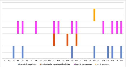 Por ejemplo, el E25 expresó: ''Porque usé la jerarquía de operaciones y las leyes de los exponentes, no incurriendo en lo que expliqué en el inciso anterior'' (refiriendo a la consigna a). Ocho de los estudiantes se basan en la descripción de sus procedimientos para indicar que lo han hecho correctamente, aunque no haya sido de este modo. Por ejemplo, E18 expresa: ''Porque según mis análisis y operaciones, mis simplificaciones son correctas''. Dos estudiantes refirieron a las reglas del álgebra como etiqueta general sin especificar (E1, E20): ''son correctas porque apliqué las reglas del álgebra'', y también dos no contestaron a la consigna (E19, E22). Es importante mencionar que ninguno de los estudiantes refirió a los cuatro elementos de información que se pusieron en juego en las tareas (jerarquía de las operaciones, propiedades de las operaciones, leyes de los exponentes y ley de los signos).