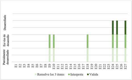 De los resultados se concluye que no todos los estudiantes resuelven, interpretan y validan de manera homogénea, es decir, obtienen respuestas no adecuadas a las 3 acciones. Esta evidencia lleva a formular estadios de desarrollo para el nivel 1 de competencia algebraica, es decir, solo es posible afirmar que tres estudiantes tienen un primer nivel. Se puede mencionar que dicha competencia está en vías de desarrollo para E9, E10 y E11, porque presentan inconsistencias al validar la tarea planteada, pero sí resuelven e interpretan. Se encontró que los estudiantes que no resolvieron de manera correcta tuvieron dificultades para abordar las acciones de interpretar y validar. Los estudiantes que no fueron consistentes en las tres acciones, no alcanzaron un estatus en el desarrollo de un primer nivel de competencia algebraica (Figura 8). Esta perspectiva sugiere información sobre los aspectos a fortalecer en los estudiantes y permite una aproximación a la competencia esperada, en este caso, un nivel 1.