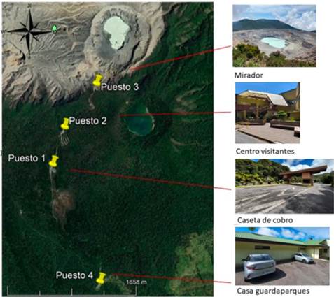 Las estaciones de muestreo se definieron de acuerdo con la cantidad de equipos disponibles y en relación con los lugares más frecuentados por las personas, sean guardaparques o visitantes. Las coordenadas geográficas de los puestos de recolección de datos fueron: puesto 1: caseta de entrada 10°10’52,88”N y 84°14’16,27”O, puesto 2: centro para visitantes 10°11’8,25”N y 84°14’10,96”O, puesto 3: mirador para visitantes borde sur del cráter principal 10°11’26,13”N y 84°13’57,69”O y puesto 4: casa guardaparques 10°10’4,02”N y 84°13’57,35”O. Los puestos se detallan a continuación en la figura 1.