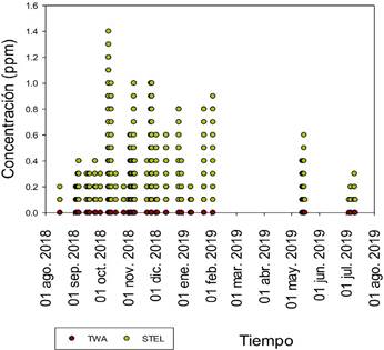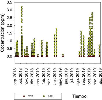 Para el SO2 se determinó que los datos de TWA no son mayores al límite superior establecido (2,0 ppm), por lo que no hay evidencia de exposición laboral tóxica para este gas en un tiempo de ocho horas.