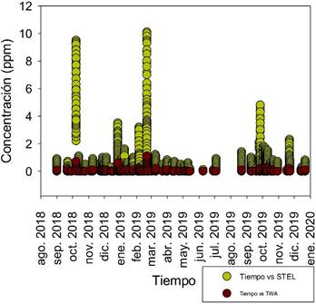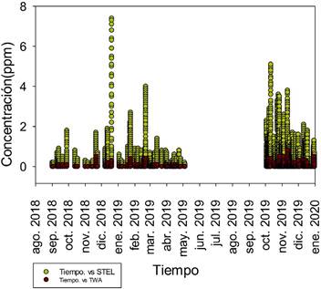 El valor de TWA experimental para los gases SO2 y H2S no fue sobrepasado en ningún punto, se considera un valor ambiental máximo permitido en un periodo de ocho horas o en una semana de 40 horas; con respecto al STEL, se observaron datos superiores al límite permitido de 5 ppm. Al ser el STEL un valor máximo permitido en un periodo de 15 minutos.