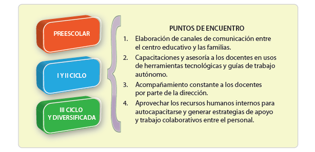 Como se puede observar en la tabla 1, en preescolar y I y II ciclo el trabajo desarrollado incluye directamente a las familias, las cuales juegan un rol muy relevante en el acompañamiento del grupo de estudiantes en el proceso educativo, para esto era necesario, como menciona una de las directoras entrevistadas, empoderar a los miembros encargados, ya que ellos asumieron un papel protagónico en la formación de sus hijos e hijas, especialmente en el seguimiento de los hábitos de estudio, rutinas diarias y disciplina.