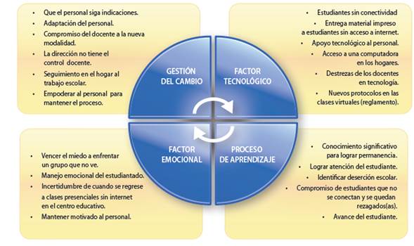 Finalmente, otro factor que indica la mayoría de las personas participantes del estudio es el emocional. Debido a la incertidumbre que genera esta situación en todos los actores y niveles educativos, mantener motivado al personal, es otro gran reto que debe superar el líder educativo. También, un elemento de este componente del factor emocional que llama mucho la atención tiene que ver con vencer el miedo a enfrentar un grupo que no ve, según mencionaron dos directoras, haciendo alusión a todos los procesos de seguimiento que tienen que desarrollar con el personal docente, por medio de plataformas tecnológicas.