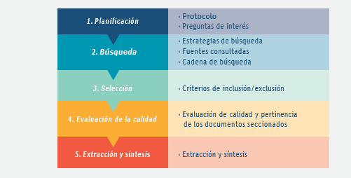 Etapa 1: Planeación. Se enfoca en desarrollar un protocolo para la revisión sistemática. Se detalla el alcance de la revisión y las acciones a seguir para lograr los objetivos. En este estudio se establecieron las preguntas de interés, las estrategias de búsqueda, los criterios de inclusión/exclusión y de evaluación de calidad, y los procedimientos para la extracción y síntesis de datos. Las preguntas de interés se presentan a continuación, y los otros elementos del protocolo se describen en las etapas siguientes.